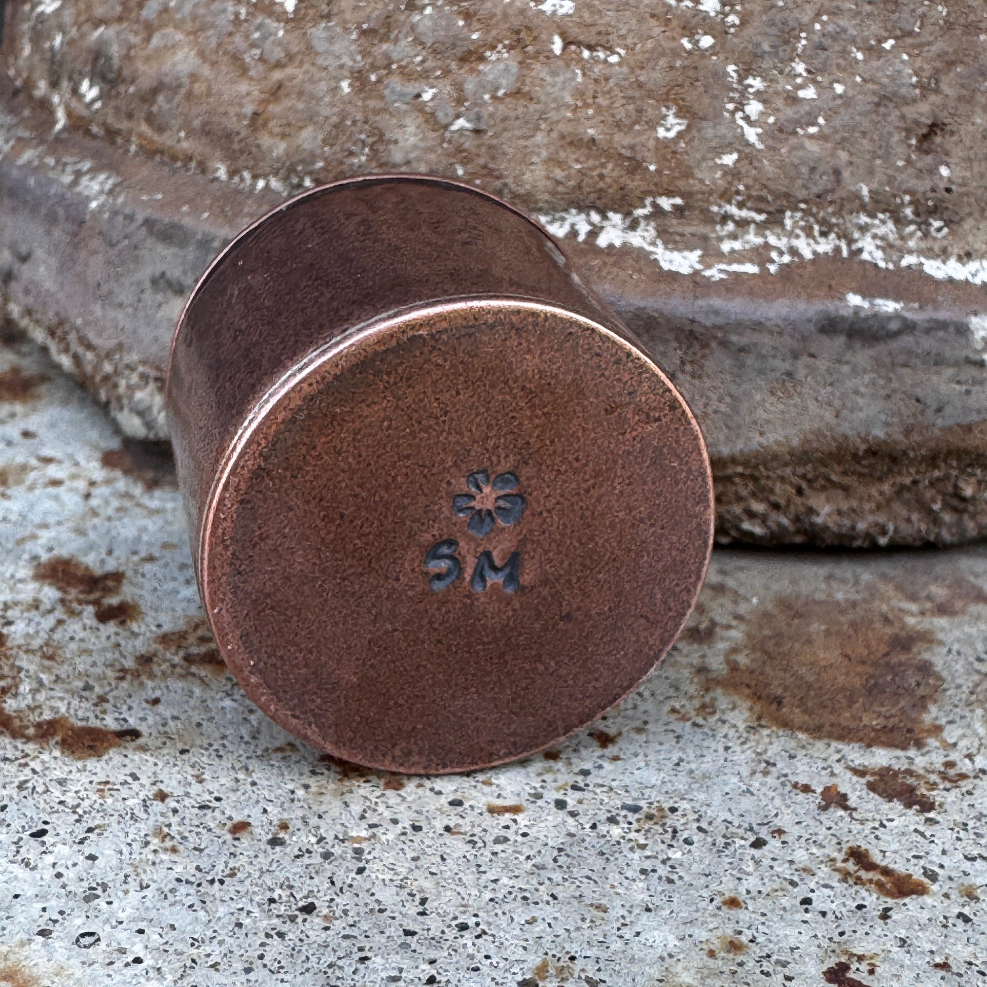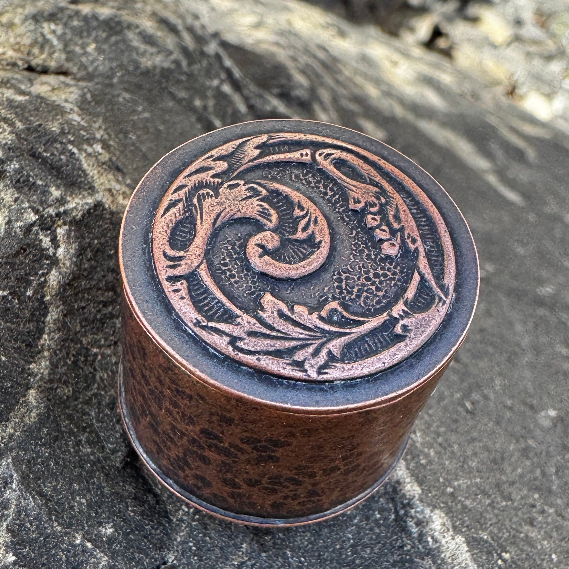 The copper is given a hammered finish for the body of the box and the Art Deco flower design on the lid is achieved by an impression design from the jewelry industry of long ago. The lid fits snugly, but is not to be considered waterproof. The bottom is stamped with my initials.